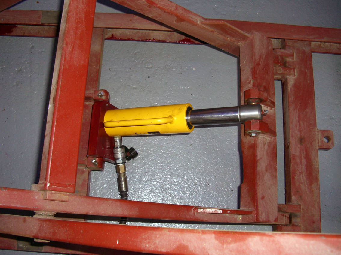 La pièce maîtresse: le vérin Comme pour le cric, c'est d'abord la longueur fermée qui prime, les courses et les charges n'ont pas posé trop de soucis, c'est plutôt mieux qu'un cric. Mon choix s'est finalement arrêté chez HYDRAFORE, spécifications et prix convenables: Vérin 10 tonnes sous 700 bar, course 150 mm, tuyau de 2m Pompe 700 bar commandée par air comprimé Adaptation: Le vérin étant un poil plus long, j'ai creusé la plaque d'embase d'environ 8 mm, ce qui permet aussi de verrouiller le vérin de ce coté. J'ai refait la pièce de liaison dans la chape et ôté l'embout de tige, inutile et le vérin a trouvé sa place. Au final, ce montage est beaucoup plus simple à réaliser qu'une commande mécanique, de plus j'ai gagné en performances, charge et course, le rendement est bien meilleur. Petite modification après coup: Insertion d'une vanne à aiguille en sortie de pompe afin de verrouiller la table en hydraulique (elle retombait sur les butées de sécurité au bout de quelques minutes), le clapet de la pompe n'était pas parfaitement étanche. Cette vanne procure aussi une meilleure modulation de la descente sous charge.
