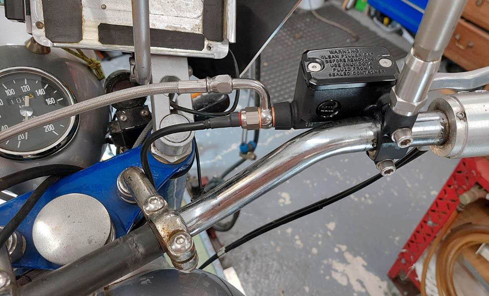 Après quelques mois de roulage, la garniture s'est bien mise en place. Du coup, la course du levier au guidon a diminué rendant la manœuvre plus ferme. Comme le frein arrière fonctionnait bien avec un émetteur de diamètre 13, je me suis lancé à remplacer la vieille poignée Lockheed en 15.8 par une en 13 de Brembo. La différence de sensation est très nette, surtout avec une courbure du levier plus ergonomique: